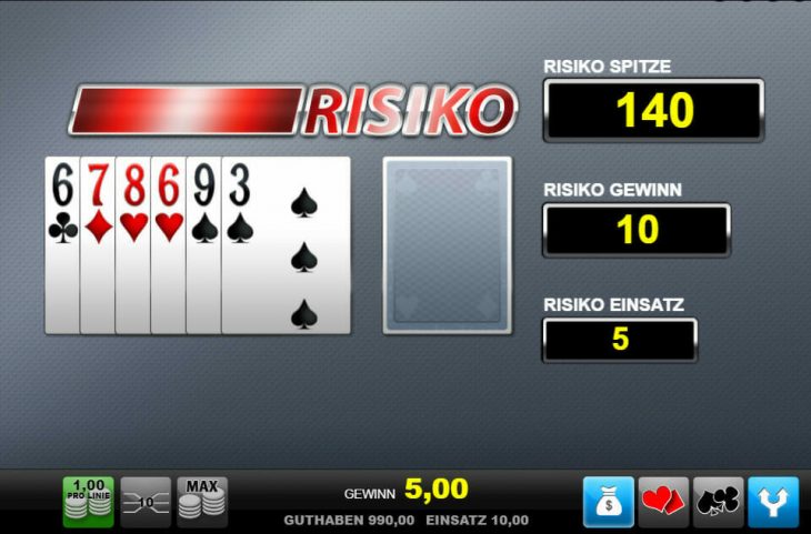 Alternativ gibt es das Kartenrisikospiel. Auch hier besteht die Chance, den in der vorigen Runde erzielten Betrag stufenweise zu verdoppeln. Damit dies gelingt, muss die nächste Kartenfarbe vorhergesagt werden. Wird Rot gewählt und aufgedeckt, erhöht sich der Gewinn. Wer falsch liegt, kann allerdings auch hier alles auf einen Schlag verlieren.